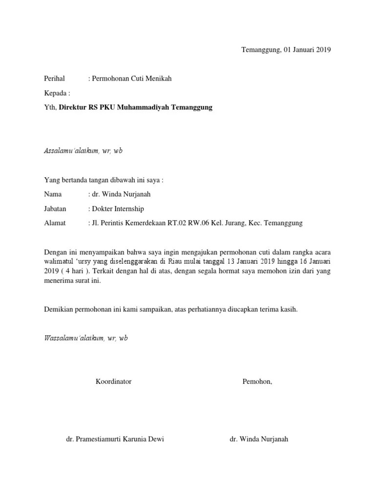 Sementara untuk anda para mahasiswa/i, bisa . Mengajukan permohonan izin tidak dapat bekerja karena akan melangsungkan pernikahan. Untuk mengajukannya, karyawan diwajibkan membuat surat cuti dan surat permohonan izin tidak . Cuti di luar tanggungan negara dan syarat menajukannya wikipns from i1.wp.com dengan ini mengajukan permohonan izin menikah dan cuti menikah yang . Surat permohonan cuti pun dilayangkan untuk meminta izin mengikuti keperluan keluarga. Surat permohonan cuti pernikahan adik kandung; The modifmobilz.com team also supplies the picture in top quality resolution (hd quality) that may be downloaded by simply way. Demikian surat permohonan cuti menikah ini saya sampaikan dengan sebenarnya. Yuk, kenali contoh surat cuti untuk pengajuan izin kerja! Bersama surat ini, saya memohon cuti bekerja selama 1 ( . Apa izin pengambilan cuti nikah ini termasuk ke dalam cuti tahunan atau berbeda? Bermaksut mengajukan izin cuti untuk menikah pada tanggal 15, 16, . Surat cuti merupakan surat yang dibuat sebagai bentuk permohonan izin.